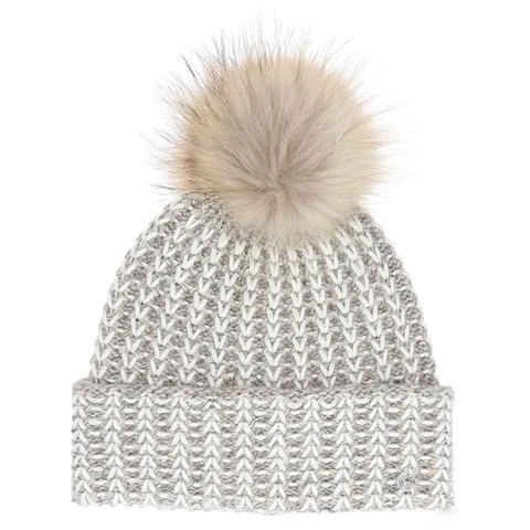 Extra-fine tweed merino handknit cuffed beanie with generous fit and tanuki fur pom